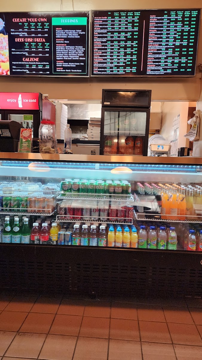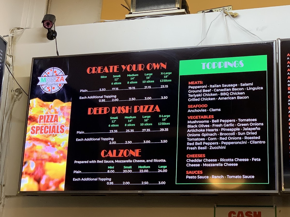 Monza Pizzeria offers a diverse menu that is sure to satisfy a variety of tastes. For those craving hearty sandwiches, options like the Grilled Chicken Sandwich, Philly Steak Sandwich, and Bacon Cheeseburger are popular choices. The pizzeria also serves a range of Deep Dish Pizzas in different sizes, including the 12" Plain (Small) and the 16" Plain (Large). Their Entrées menu features classic dishes like Chicken Parmigiana and New York Steak, perfect for those looking for a fulfilling meal. For appetizers, the Buffalo Wings (10) and Fried Mozzarella Sticks (8) stand out, alongside Garlic Bread with Cheese and crispy Onion Rings. The Create Your Own Pizza option is ideal for customizing a pizza with a variety of toppings, while their Signature Pizzas, such as the Clara and Roma, offer unique flavor combinations. Fresh salads like the Caesar Salad and Greek Salad make for lighter options, and the Calzone range, from Plain (Mini) to Plain (Large), provides a deliciously stuffed dough experience. Don’t forget to save room for dessert, with choices including Chocolate Mousse Cake, Tiramisu, and the classic Cheesecake. To accompany your meal, beverages like Orange Juice, Soda, and Apple Juice are available. Whether you're stopping by for a quick bite or enjoying a full meal, Monza Pizzeria's menu offers something for everyone.